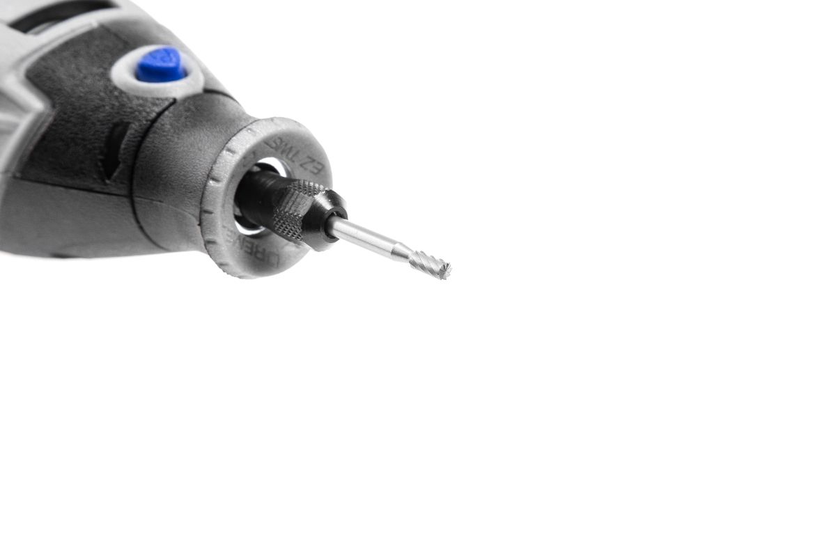- Мини-дрель оснащена коническим колпачком EZ Twist для затягивания/ослабления цанги при смене насадки. Удерживая кнопку блокировки вала, просто вращайте колпачок.
