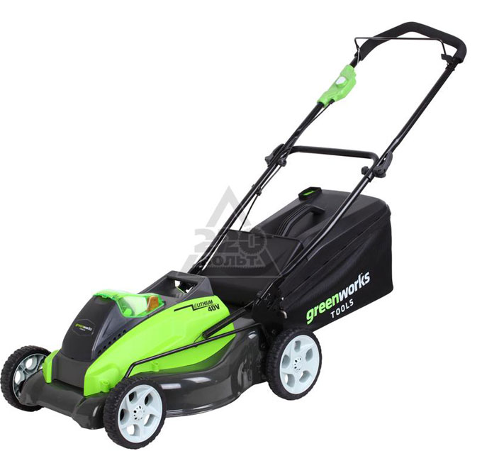 - Газонокосилка оснащена универсальным аккумулятором G-MAX40. Он совместим со всей техникой GREENWORKS соответствующего вольтажа. (не входит в комплект)