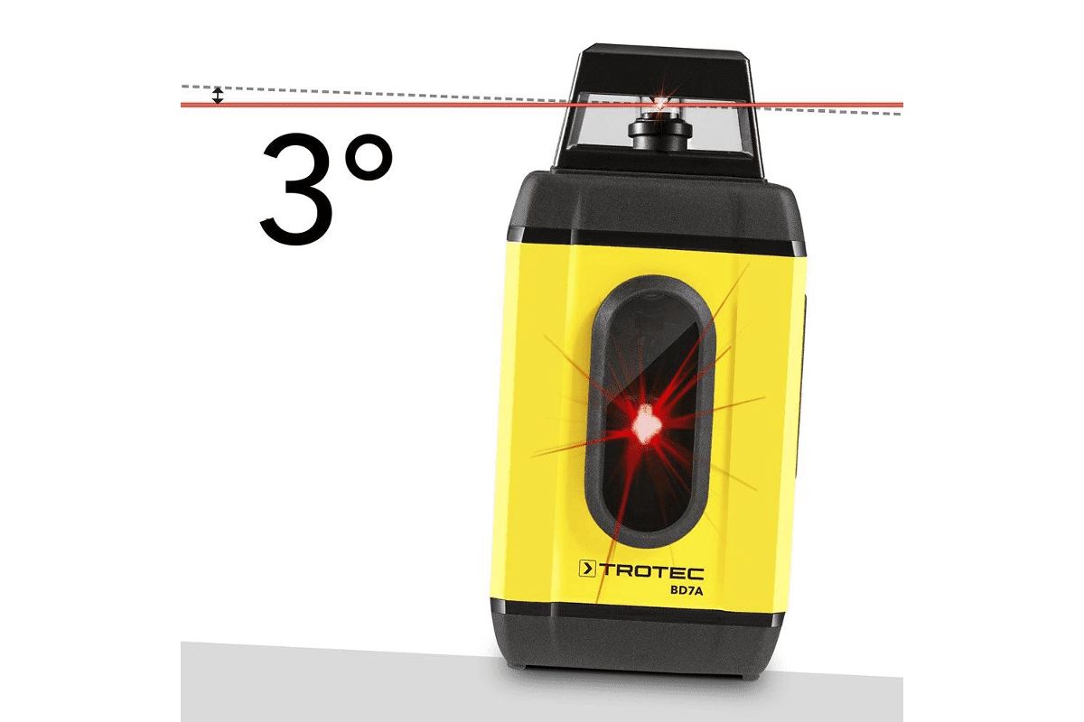 Trotec BD7A - это современный построитель плоскостей. С помощью вращающегося на 360° лазера, прибор проецирует горизонтальный уровень одновременно на 4 стены помещения. Если вы хотите точно выровнять картину, просверлить отверстия по прямой линии или положить плитку по строгой сетке - все это теперь можно сделать по всей комнате, причем, без дополнительных перестановок и регулировок прибора. При необходимости BD7A проецирует вертикальную лазерную линию на противоположную стену, например, для выравнивания изображений и полок или для укладки плитки в точную сетку. Проекция наклонной линии разметки с произвольно регулируемым углом занимает минимум времени. Даже сложная установка перил, параллельных лестнице, становится простой задачей с BD7A. Комбинированный держатель с универсальным зажимом и присоской позволяет использовать множество вариантов крепления. BD7A можно легко разместить в любом месте, точно выровнять и наклонить с помощью регулируемых петель на комбинированной опоре. Высококачественный корпус нивелира изготовлен из окрашенного алюминия и идеально подходит для повседневной работы. Встроенный лазер самовыравнивается и автоматически компенсирует неровности пола под углом до 3°. Самовыравнивание занимает всего несколько секунд и происходит сразу после включения устройства. Если самовыравнивание невозможно из-за большей неровности или загрязнения, прибор просигнализирует светодиодом на корпусе. Нивелир оборудован гнездом с резьбой 1/4 для установки на стандартные штативы.